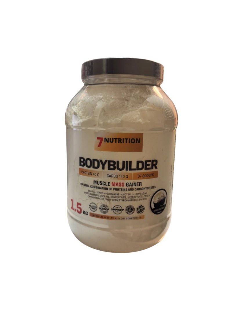 Гейнер Bodybuilder Muscle Mass от 7Nutrition 1500гр - углеводно-белковая добавка для бодибилдеров, содержащая высококачественный кукурузный крахмал, рисовый крахмал, концентрат и изолят сывороточного протеина. Этот продукт дополнительно обогащен растительным маслом MCT и мицеллярным казеином. Продукт обеспечивает огромное количество энергии, одновременно увеличивая продолжительность и объем тренировок. Позволяет покрыть даже высокую потребность в калориях. Дополнительное количество аминокислот BCAA и глютамина значительно ускоряет процессы восстановления.